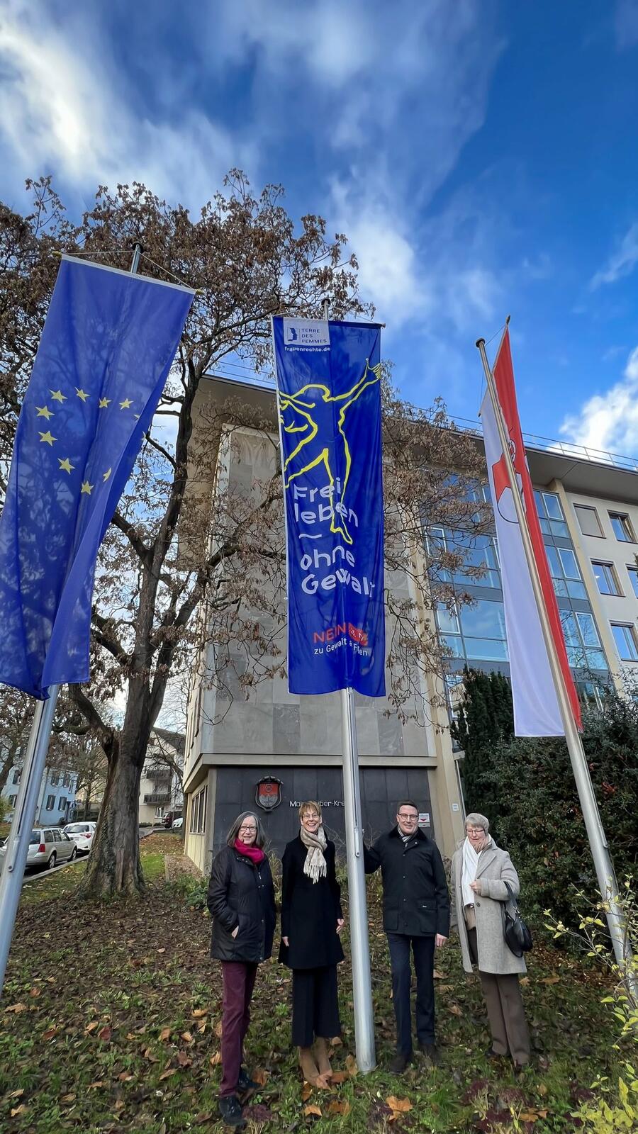 Landrat Christoph Schauder und Elisabeth Krug, Dezernentin für Jugend, Soziales und Gesundheit beim Landratsamt Main-Tauber-Kreis, haben zum Internationalen Tag gegen Gewalt an Frauen am Samstag, 25. November, ein gemeinsames Zeichen mit Vertreterinnen des Vereins „Frauen helfen Frauen“ gesetzt. Vor dem Hauptgebäude des Landratsamtes in Tauberbischofsheim wurde eine Fahne der Organisation „Terre des Femmes“ mit der Aufschrift „Frei leben, keine Gewalt“ gehisst. Sie wird von den Flaggen des Landkreises und der Europäischen Union eingerahmt.