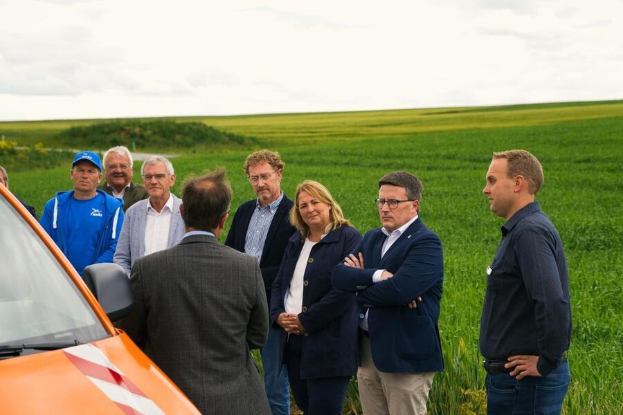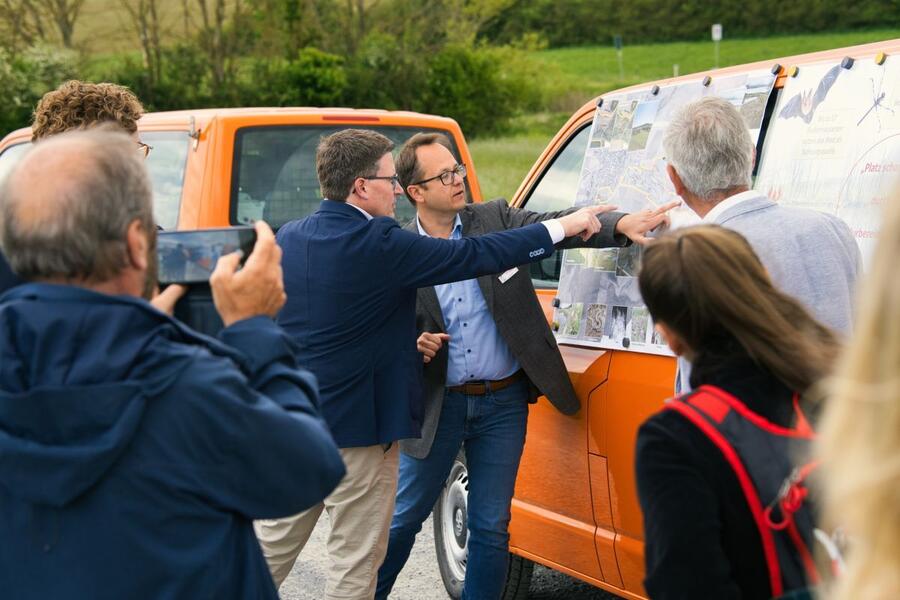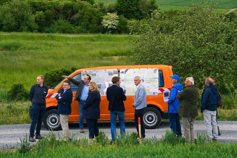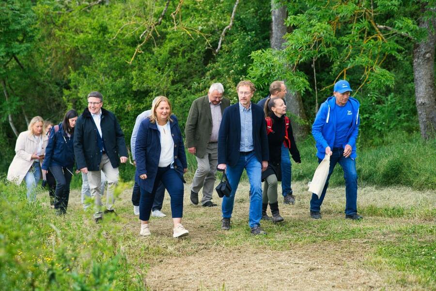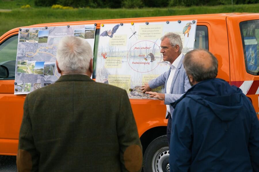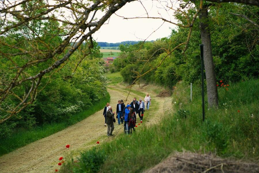Bei einem Gang durch das Flurbereinigungsgebiet stellte der im Landratsamt Main-Tauber-Kreis für die Flurneuordnung zuständige Dezernent Werner Rüger Ministerialdirektorin Kling und Landrat Schauder die einzelnen Maßnahmen vor, die sich von der Renaturierung des Insinger Bachs bis hin zur Pflanzung einer Feldhecke am neu entstandenen Feldweg am Ried erstrecken. Außer dem naturschutzfachlichen Ausgleich für den Wegebau werden zusätzlich rund 2,2 Hektar Ökokonto-Maßnahmen von der Gemeinde Wittighausen realisiert. Sie wurden im Rahmen der Flurneuordnung genehmigt und umgesetzt. Dieses Gesamtkonzept ermöglicht, dass sich die Riedfläche um das Eineinhalbfache vergrößern kann und der dort angesiedelte Biber mehr Freiraum erhält, um den Nutzungskonflikt mit der Landwirtschaft zu lösen.