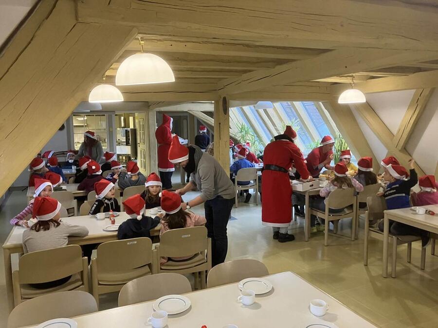 Die Sportjugend erzählte die Geschichte des Nikolauses und erklärte, wieso er so berühmt geworden ist. Gerade dieser kurze inklusive Programmpunkt rief große Begeisterung bei allen Anwesenden hervor – vor allem, weil die Nikoläuse einen Sack voller Weihnachtsmannmützen dabeihatten, welche dann an die Schüler und Lehrer verschenkt wurde.