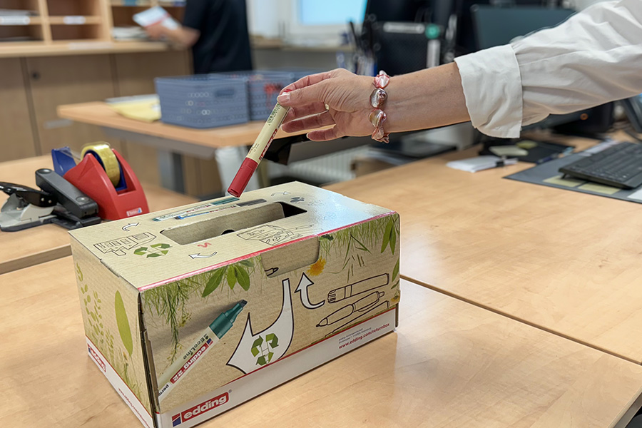 Mit den Rücknahmeboxen der Firma Edding nutzt das Landratsamt Main-Tauber-Kreis seit Anfang Juni die Möglichkeit, leere Marker und Kugelschreiber aus dem Amt dem Ressourcenkreislauf zuzuführen.