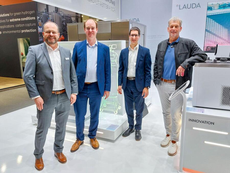Neben dem Fachpublikum machten sich auch zahlreiche Mitarbeitende, Auszubildende und Senioren aus der Lauda-Belegschaft ein Bild vom Messeauftritt. Auch prominente Gäste aus der Heimat des Familienunternehmens Lauda besuchten den Messestand: Dr. Lukas Braun, Bürgermeister von Lauda-Königshofen, Christoph Kraus, Wirtschaftsförderer, und Armin Kordmann, Geschäftsführer der i-Park GmbH & Co KG, besuchten das Lauda Team. Der Geschäftsführende Gesellschafter Dr. Gunther Wobser führte sie persönlich über den Messestand, zeigte die neuesten Innovationen, erläuterte neue Produkte und demonstrierte das Engagement für Nachhaltigkeit und Energieeffizienz.