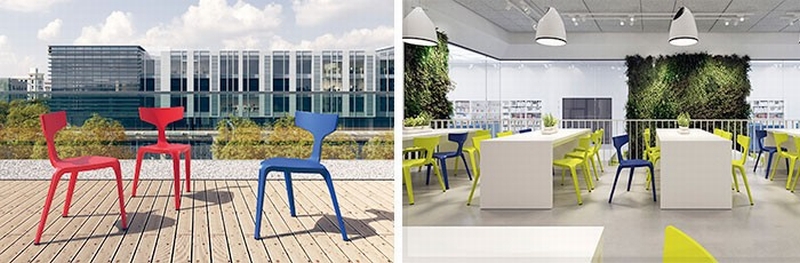 Von oben betrachtet sieht Stakki wie ein grafisch reduziertes Symbol aus, individuell und absolut unverkennbar. Der geringe Materialeinsatz macht ihn zudem sehr nachhaltig. Hergestellt wird Stakki als Monoblock im Mehrkomponentenspritzguss mit Gasinnendruckverfahren. Das gibt ihm Volumen und Stabilität bei nur 3,8 Kilogramm Gewicht. Geeignet ist er für den Innen- wie Außenbereich.